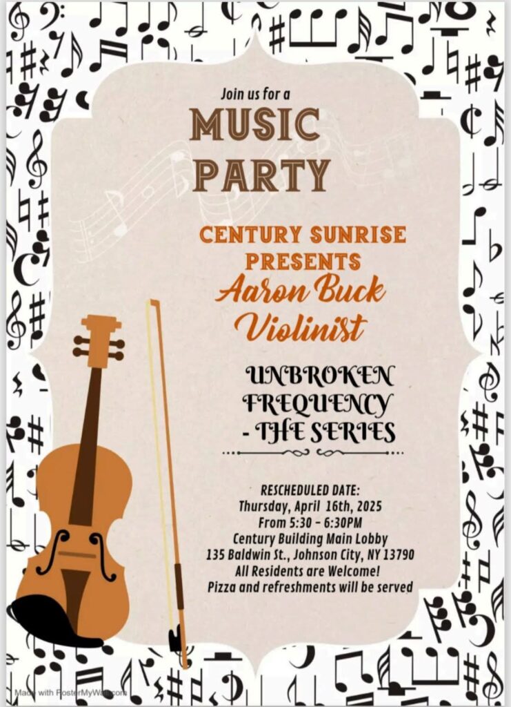 Building on the success of this event, Century Sunrise is already planning an even larger musical gathering this summer: an outdoor evening performance featuring additional string musicians from the Binghamton Philharmonic.